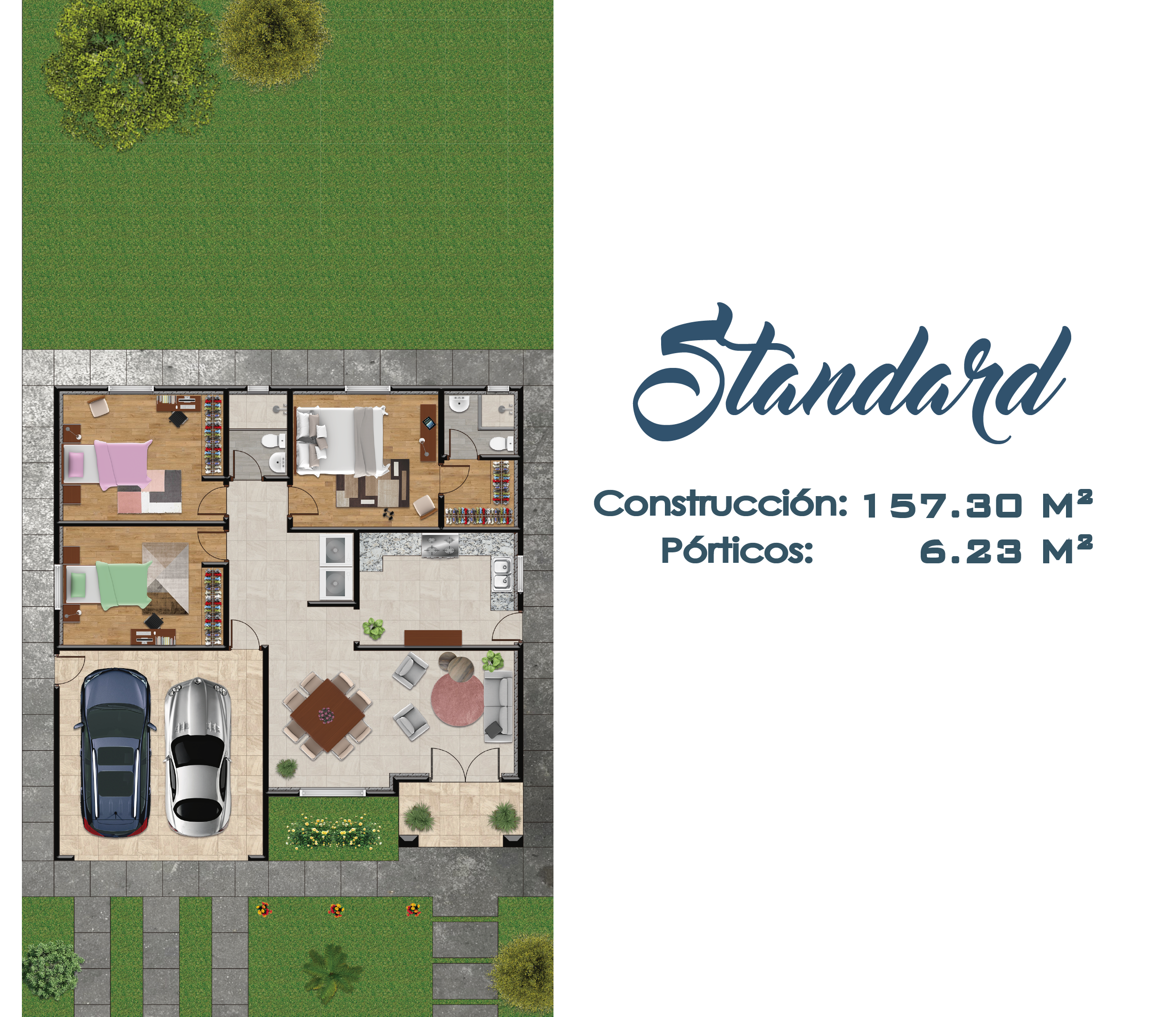 Edificación de una planta, ideal para familias pequeñas, medianas o personas mayores, este modelo cuenta con 3 habitaciones, 2 baños, cochera amplia para 2 vehículos, cocina, estancia y lavandería.