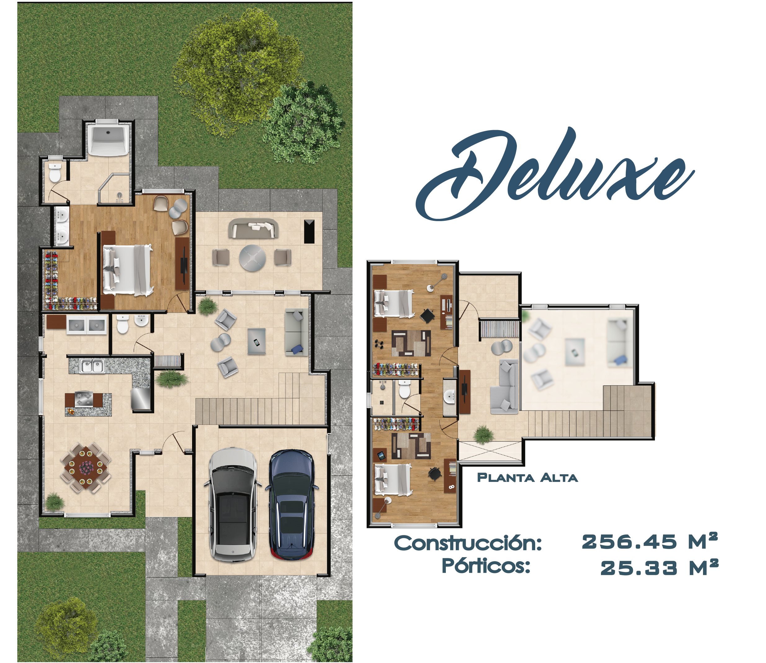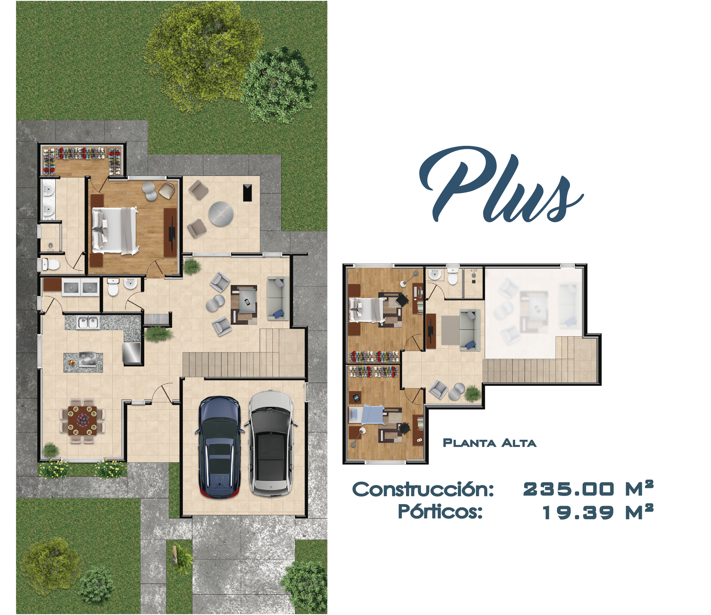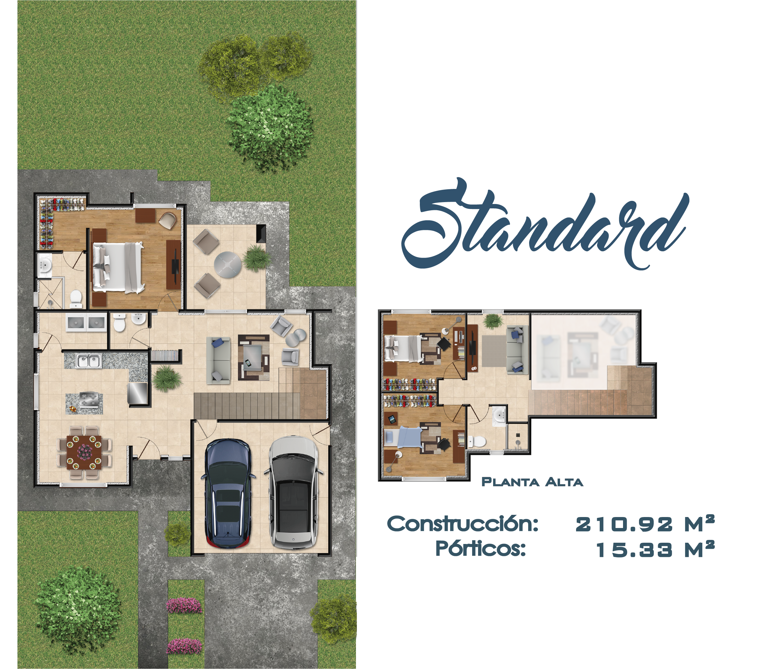 Esta edificación de 2 pisos es ideal para familias medianas. Este modelo cuenta con 3 amplias habitaciones y una principal con vestidor, 2 baños y medio para visitas, cochera amplia para 2 vehículos y lavandería.