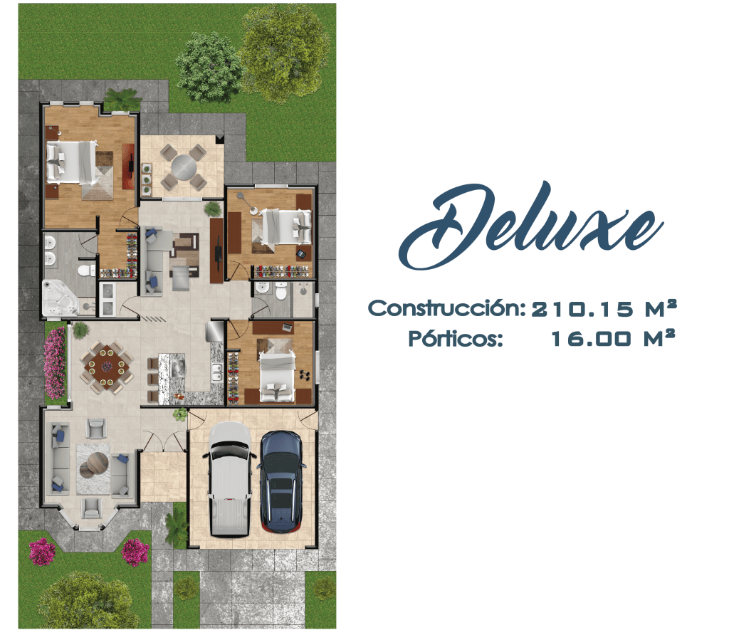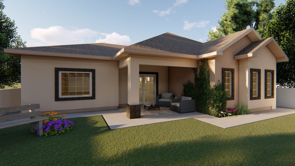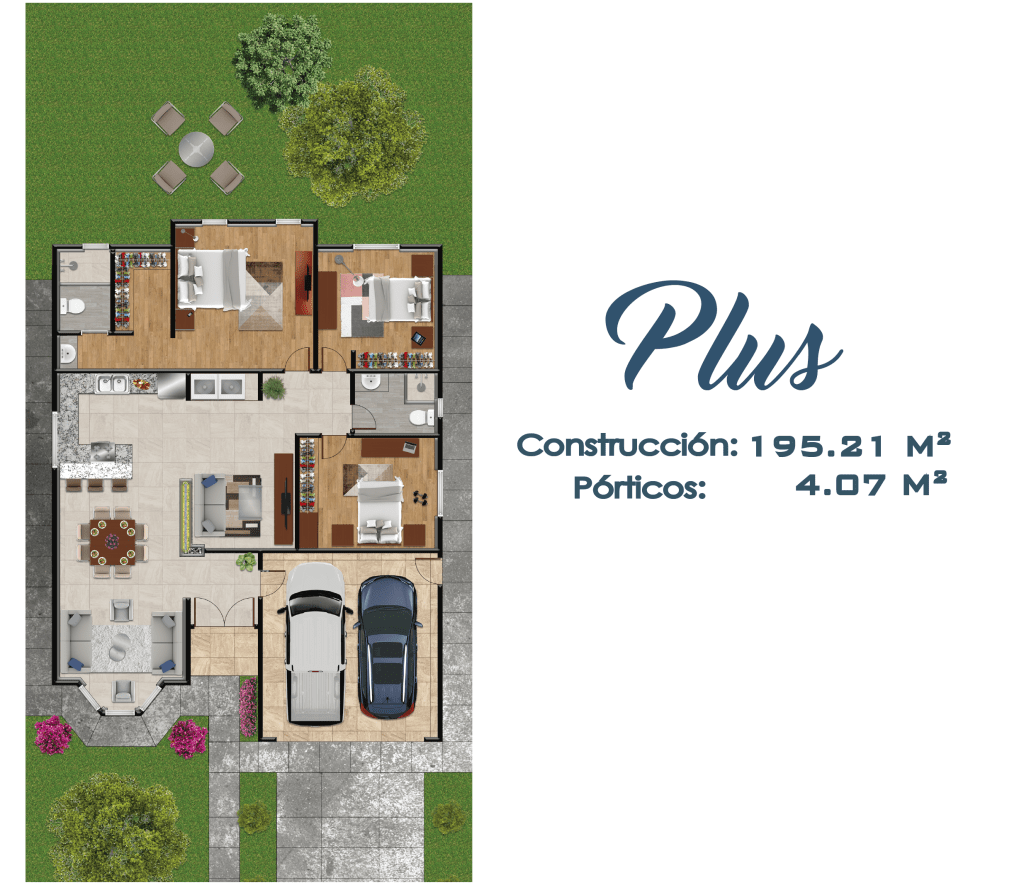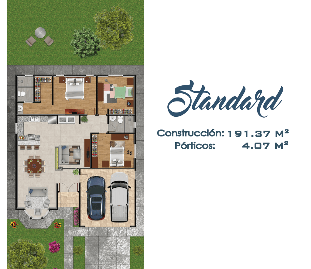 Edificación de una planta, ideal para familias medianas este modelo cuenta con 3 habitaciones y una principal con vestidor, 2 baños y medio, cochera amplia para 2 vehículos y lavandería.